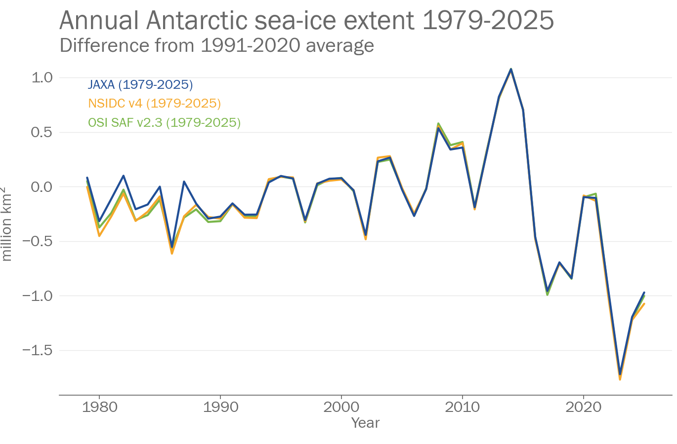 Sea-ice concentrations are estimated from microwave radiances measured from satellites (from 1979). Sea-ice extent is calculated as the area of ocean grid cells where the sea-ice concentration exceeds 15%. Although there are relatively large differences in the absolute extent between data sets, they agree well on the year-to-year changes and the trends.