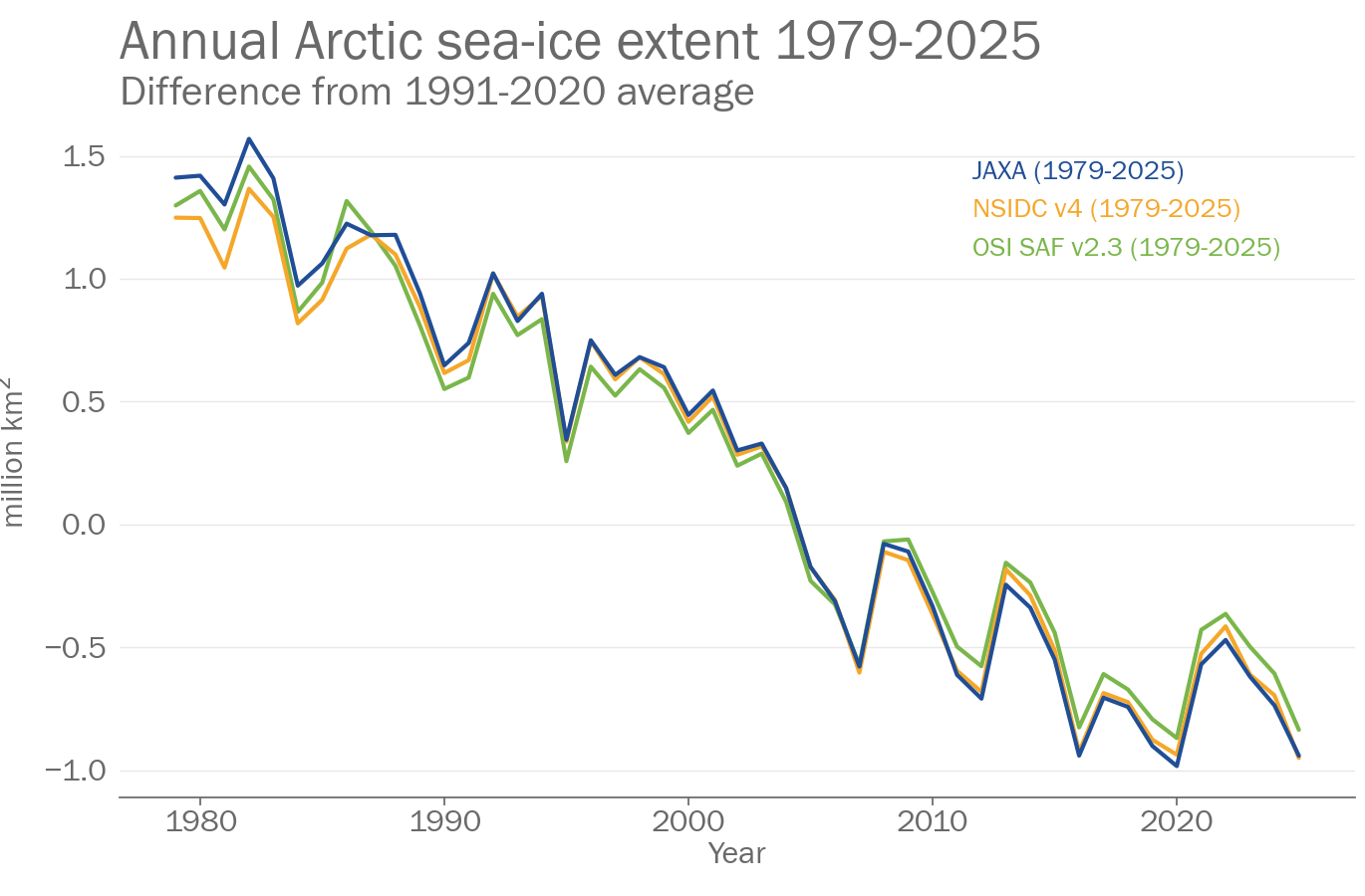 Arctic sea ice extent in March 2025 was between 13.60 and 14.18million km2. This was the 1st lowest extent on record. In September the extent was between 4.69 and 5.24million km2. This was between the 11th and 13th lowest extent on record. Data sets used were: JAXA, NSIDC, NSIDC v4, OSI SAF v2.2, and OSI SAF v2.3