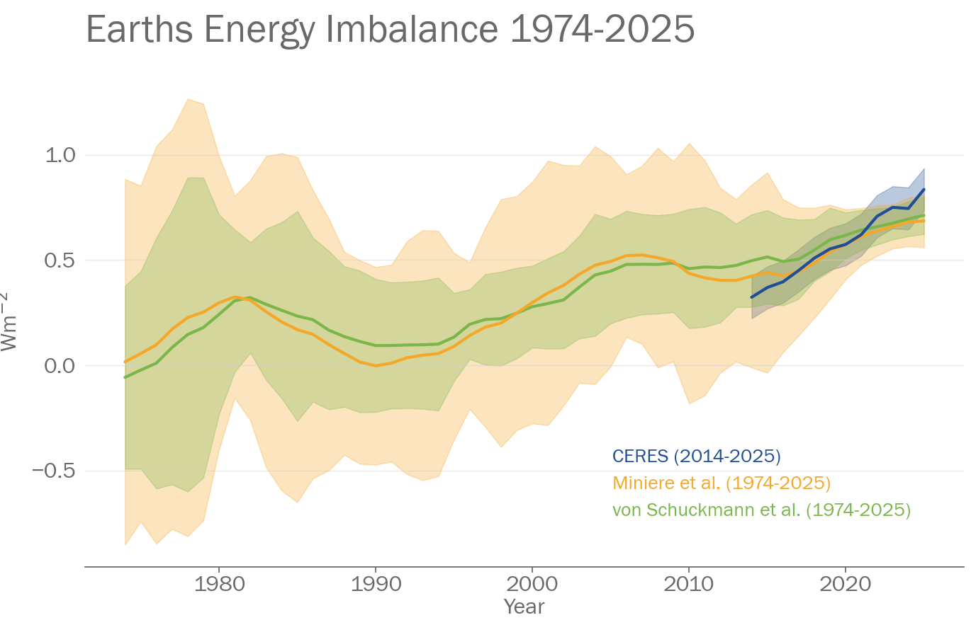 Earths energy imbalance is a measure of the net energy flux into the earth system. When the EEI is positive, the amount of energy entering the earth system is larger than the energy leaving the earth system and energy accumulates in the ocean, atmosphere, land and cryosphere, leading to warming. When the EEI is negative, the opposite happens.