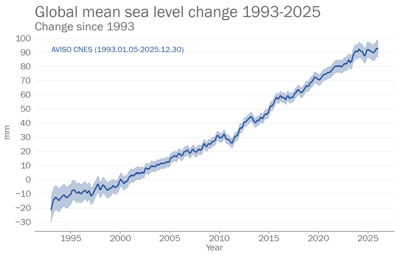 The rate of change in the AVISO CNES data set is 3.47 mm/yr between 1993 and 2025. The rate of change in the past decade 2016-2025 is 4.02 mm/yr which is higher than the trend for the first decade of the satellite record 1993-2002 which was 2.14 mm/yr. The trend for 2015-2025 was 3.97 mm/yr.