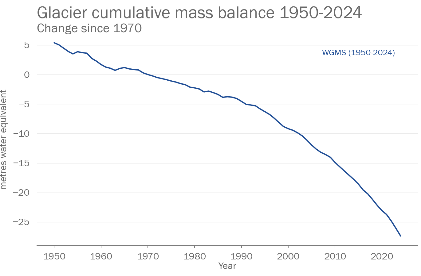 The most recent available year is 2024. This was the 37th consecutive year of negative mass balance since 1988. Cumulative glacier loss since 1970 is -27.4m w.e..