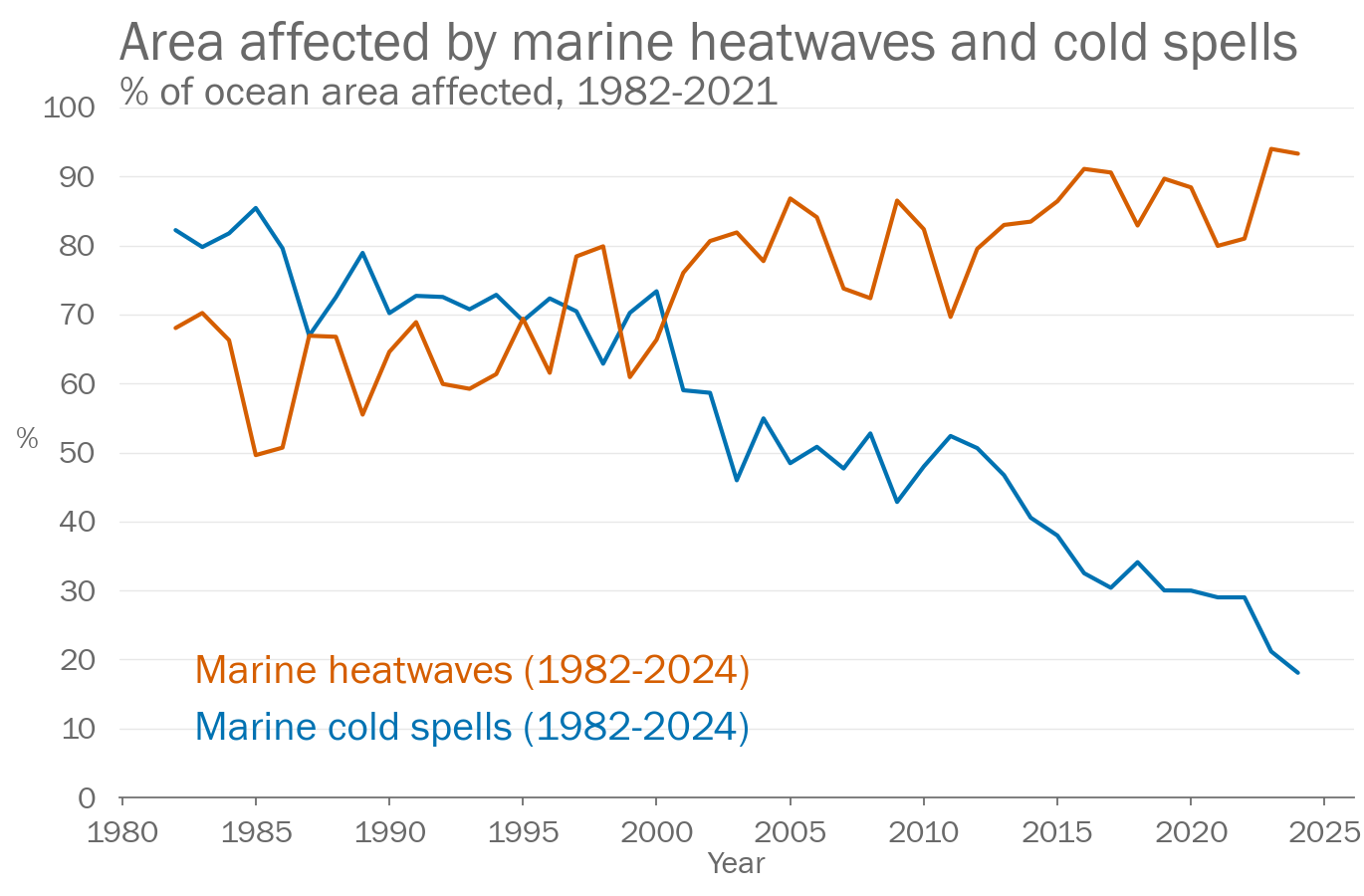 The most recent available year is 2024. In 2024, 93.3% of the ocean was affected by at least one marine heatwave. The 2nd highest on record. The highest ocean area affected in any year was 94.0% in 2023.
