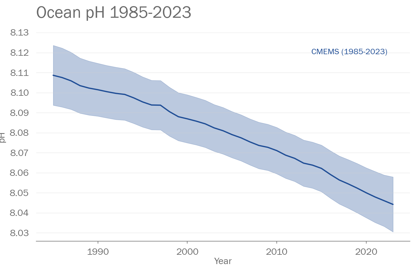 Ocean pH is a measure of how acid/alkaline the ocean surface water is. The ocean surface is typically slightly alkaline, however, increasing concentration of CO2 in the water is driving a decline in pH known as ocean acidification.