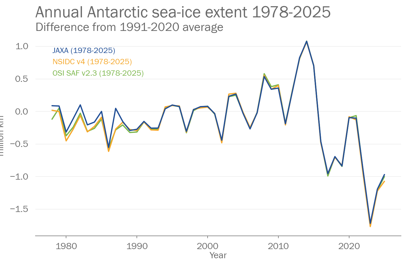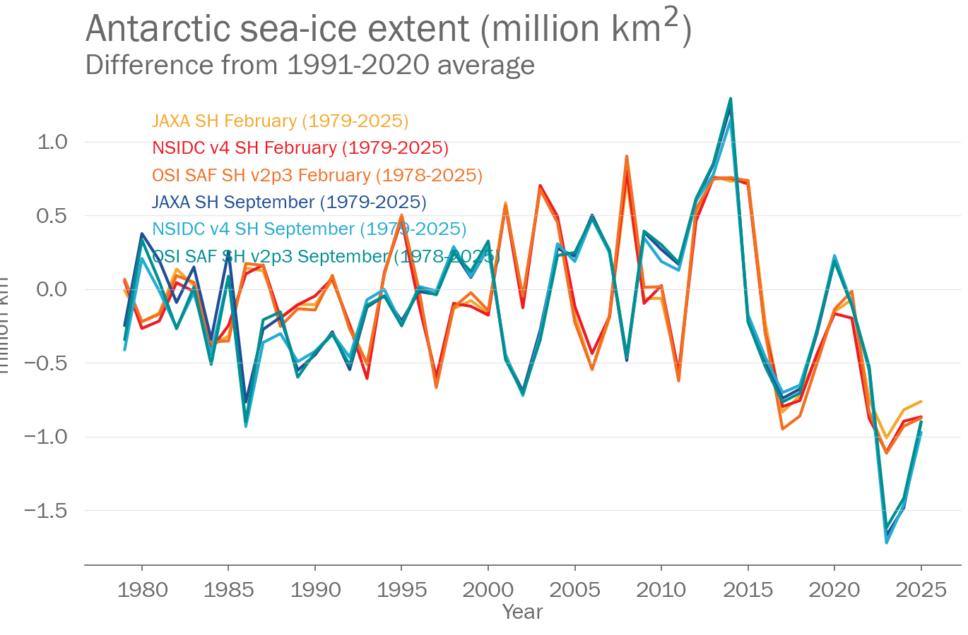 Antarctic sea ice extent in February 2025 was between 2.22 and 2.47million km2. This was the 4th lowest extent on record. In September the extent was between 17.64 and 18.07million km2. This was the 3rd lowest extent on record. Data sets used were: JAXA, NSIDC v4, and OSI SAF v2.3