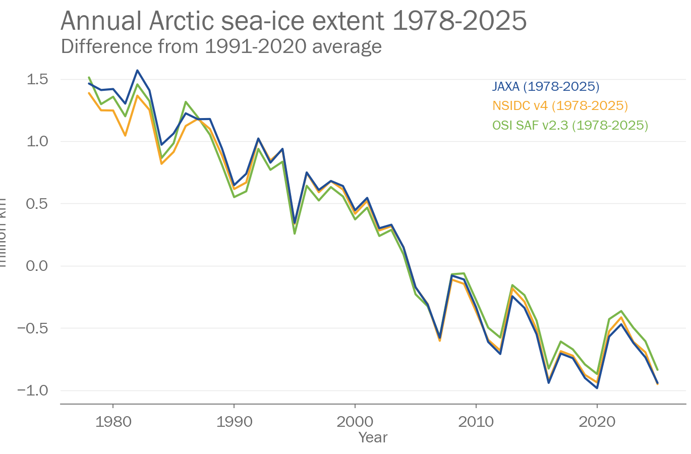Arctic sea ice extent in March 2025 was between 13.60 and 14.18million km2. This was the 1st lowest extent on record. In September the extent was between 4.69 and 5.24million km2. This was between the 11th and 13th lowest extent on record. Data sets used were: JAXA, NSIDC v4, and OSI SAF v2.3