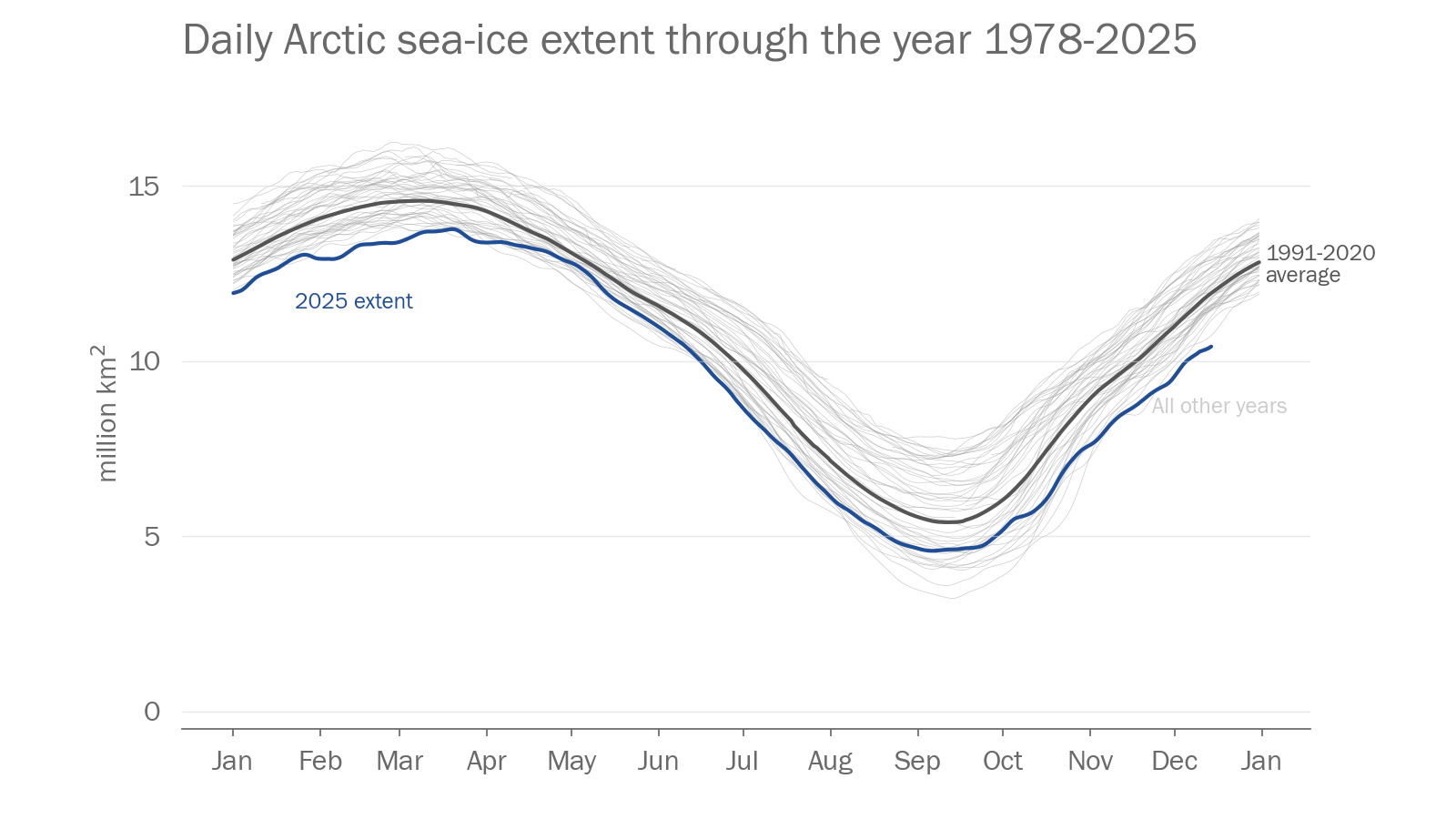 Data citation: EUMETSAT Ocean and Sea Ice Satellite Application Facility, Sea ice index 1979-onwards (v2.2, 2023), OSI-420, Data extracted from OSI SAF FTP server: 1979-present, Northern Hemisphere, accessed 2025-12-15 11:27:07