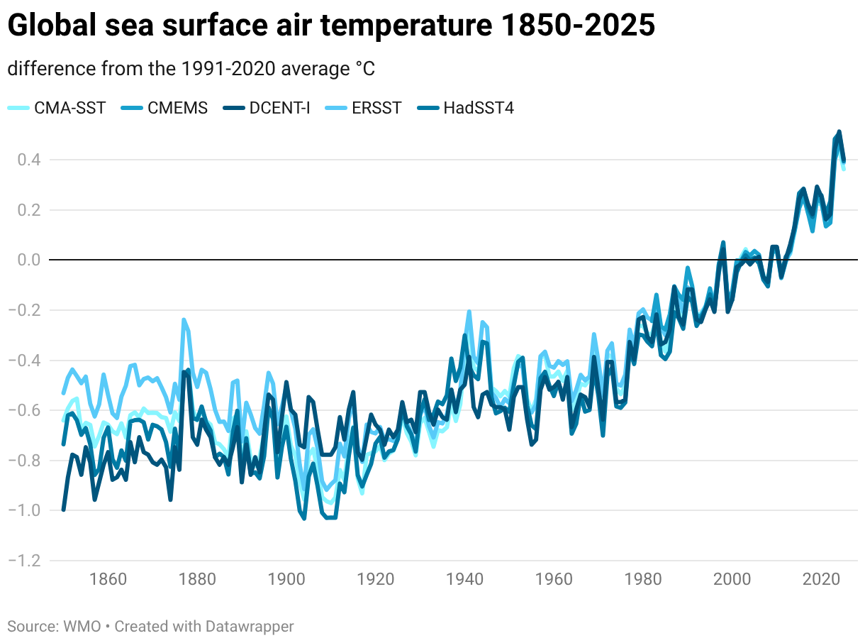Global mean temperature is based on measurements made at weather stations over land and by ships and buoys over the ocean. Temperatures are typically expressed as anomalies which are temperature differences from the average for a standard period. Here, 1850-1900 is used for the global mean. Instrumental temperature records are some of the longest climate records available, with some series extending back to the 17th century.