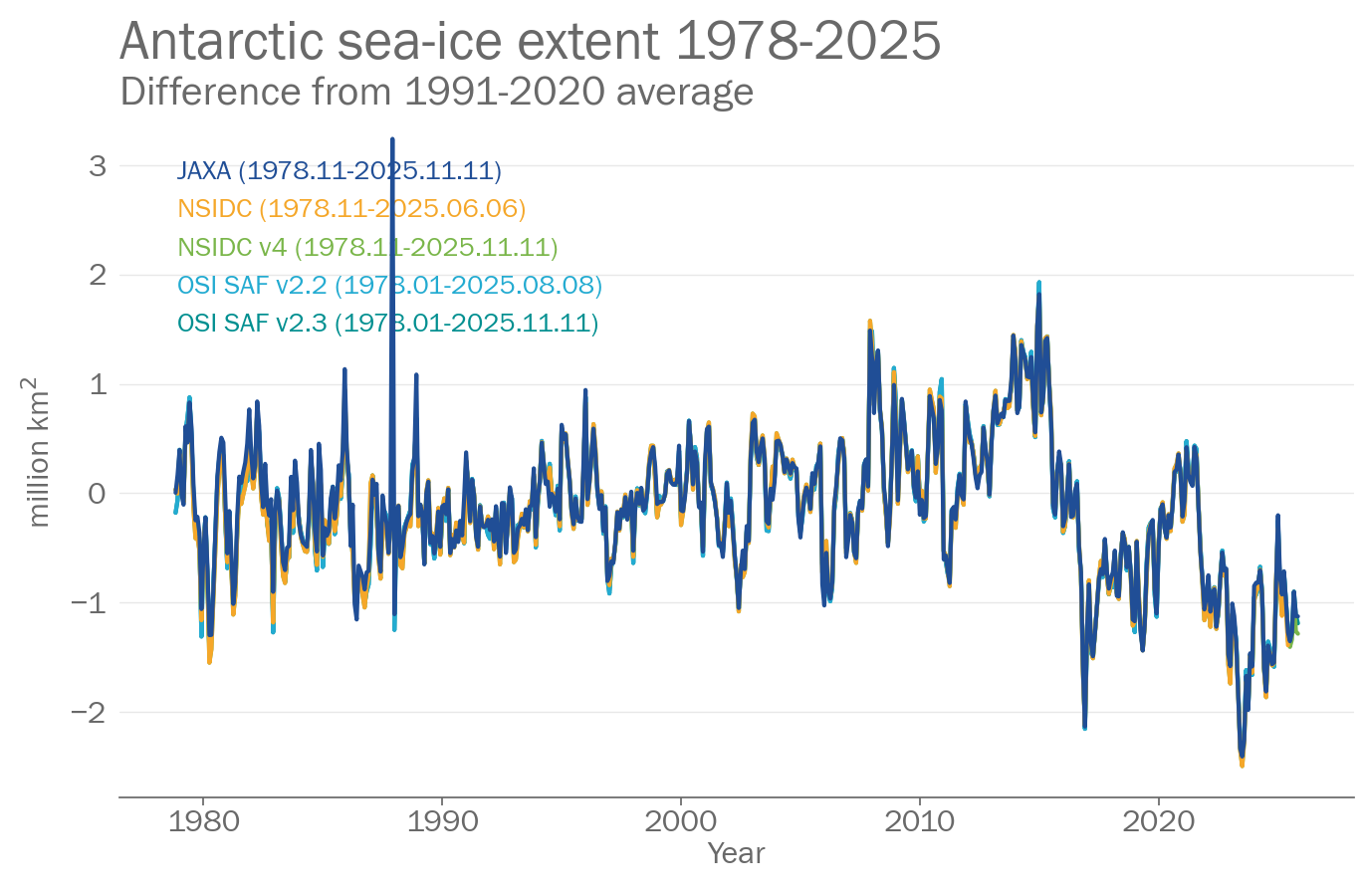 Acknowledgement: The OSI SAF Sea Ice Index v2.2 is made available at https://osisaf-hl.met.no/v2p2-sea-ice-index. The OSI SAF Sea Ice Index v2p1 is prepared using EUMETSAT OSI SAF Sea Ice Concentration data, with R&D input from the ESA Climate Change Initiative (ESA CCI) (Lavergne et al. 2019)