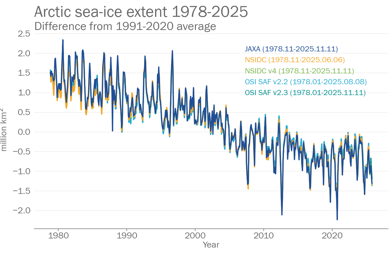 Data citation: EUMETSAT Ocean and Sea Ice Satellite Application Facility, Sea ice index 1979-onwards (v2.2, 2023), OSI-420, Data extracted from OSI SAF FTP server: 1979-present, Northern Hemisphere, accessed 2025-11-07 12:28:51
