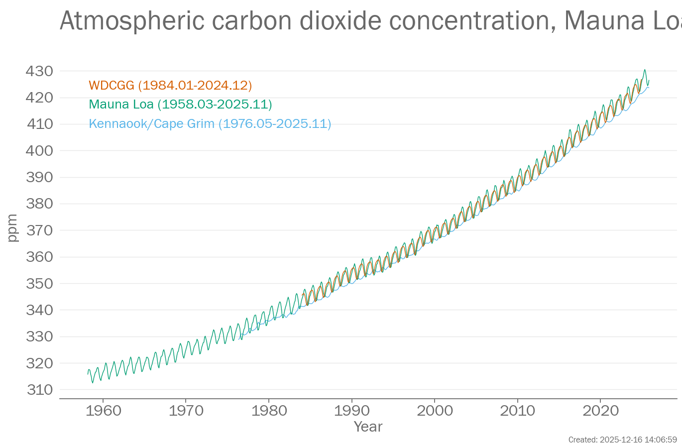 Acknowledgement: Dr. Pieter Tans, NOAA/ESRL (www.esrl.noaa.gov/gmd/ccgg/trends/) and Dr. Ralph Keeling, Scripps Institution of Oceanography (scrippsco2.ucsd.edu/).