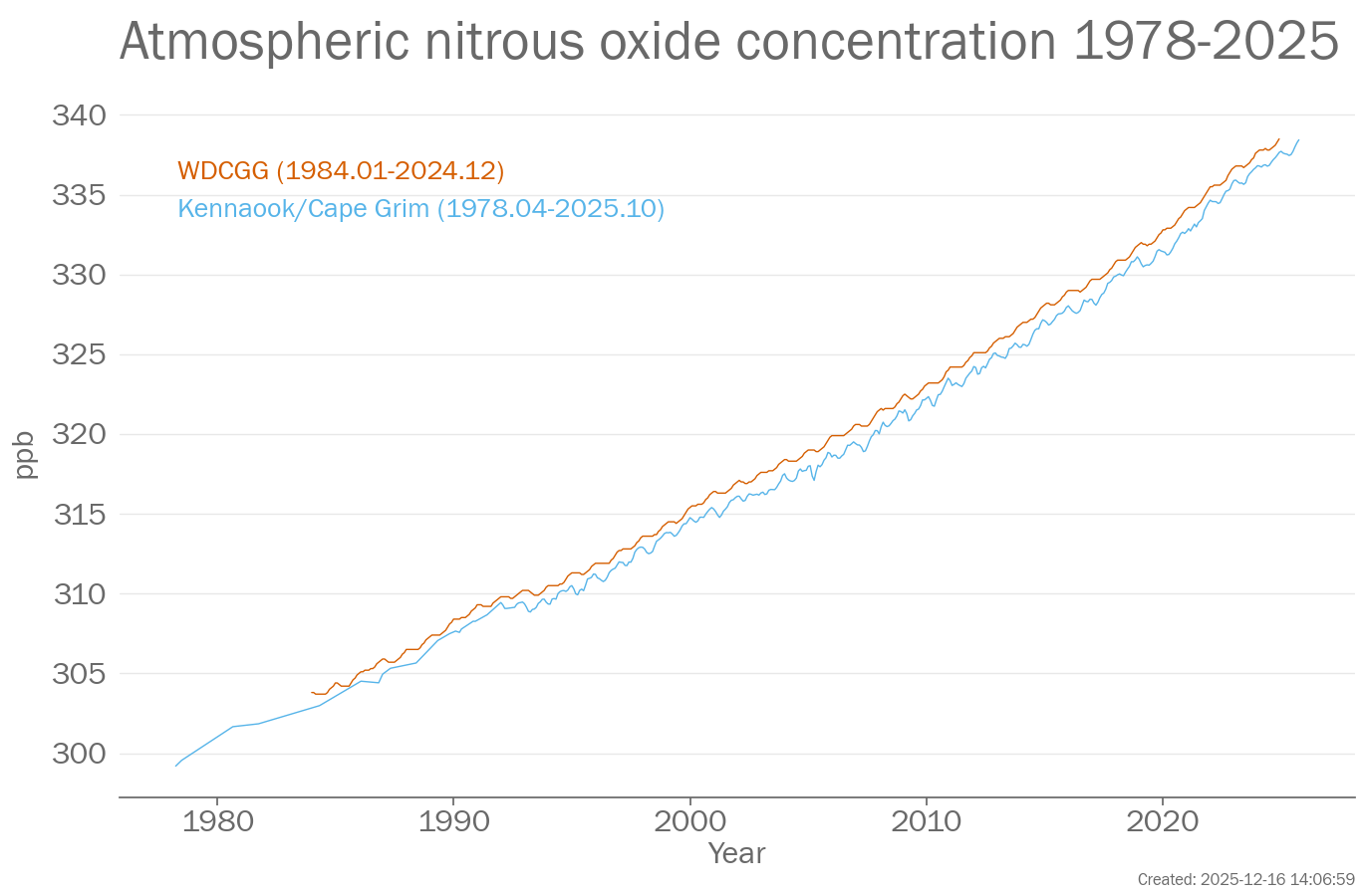 Nitrous oxide (N2O) is an important greenhouse gas. The concentration of N2O in the atmosphere is measured at stations around the world which are combined to provide a globally representative value.