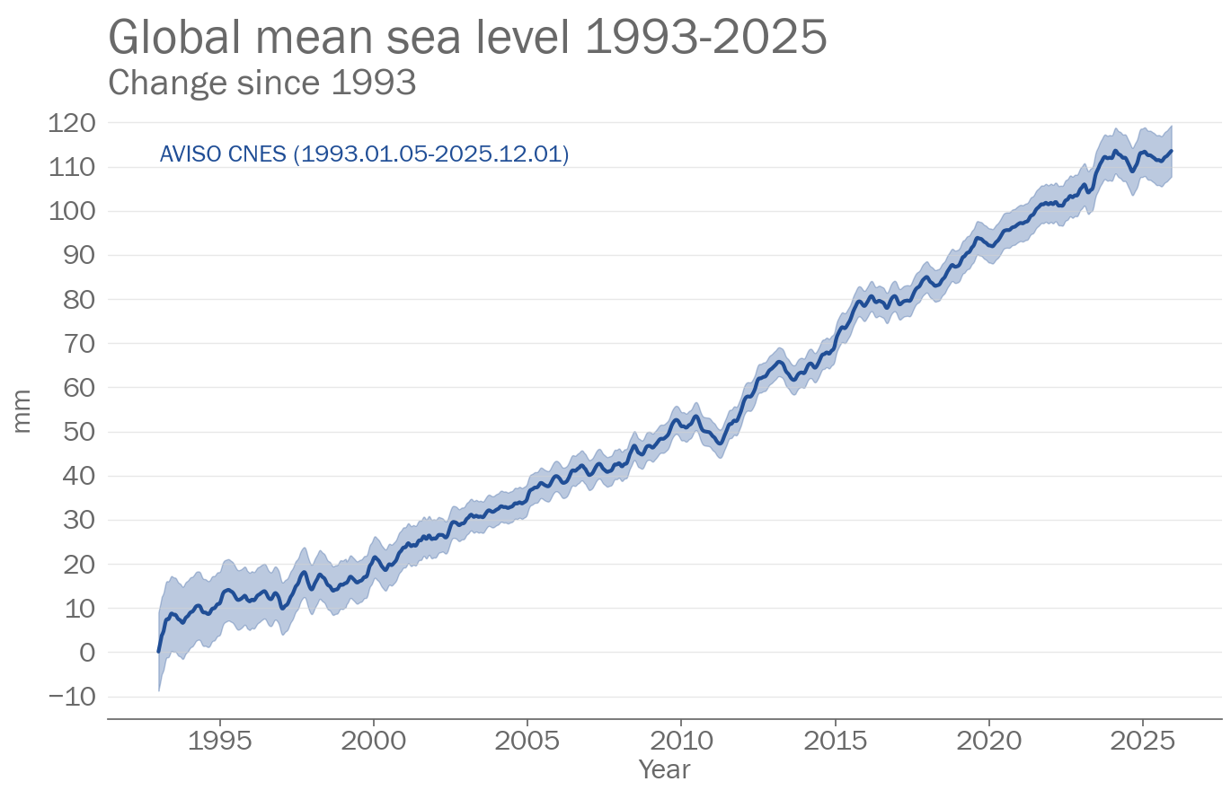 Global mean sea level is a measured by satellites using radar altimeters that record the time taken for a radar signal to reach the sea-surface and return to the satellite. Longer records of sea level (not shown here) exist based on tide gauge measurements made along coastlines around the world since the late 19th century.